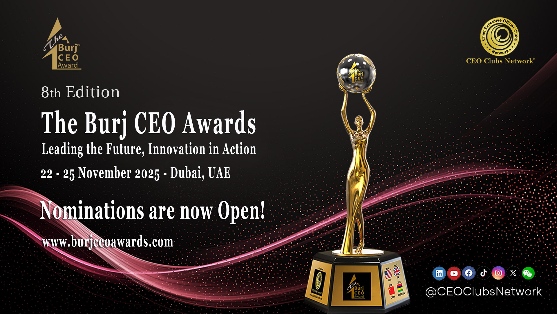 The 8th Burj CEO Awards, a hallmark of the CEO Clubs Network and globally hailed as the “Oscars of the Business World”, returns to Dubai this November. This premier event brings together visionary leaders, trailblazing entrepreneurs, and pioneering innovators for an unparalleled celebration of business excellence, leadership, and global impact.